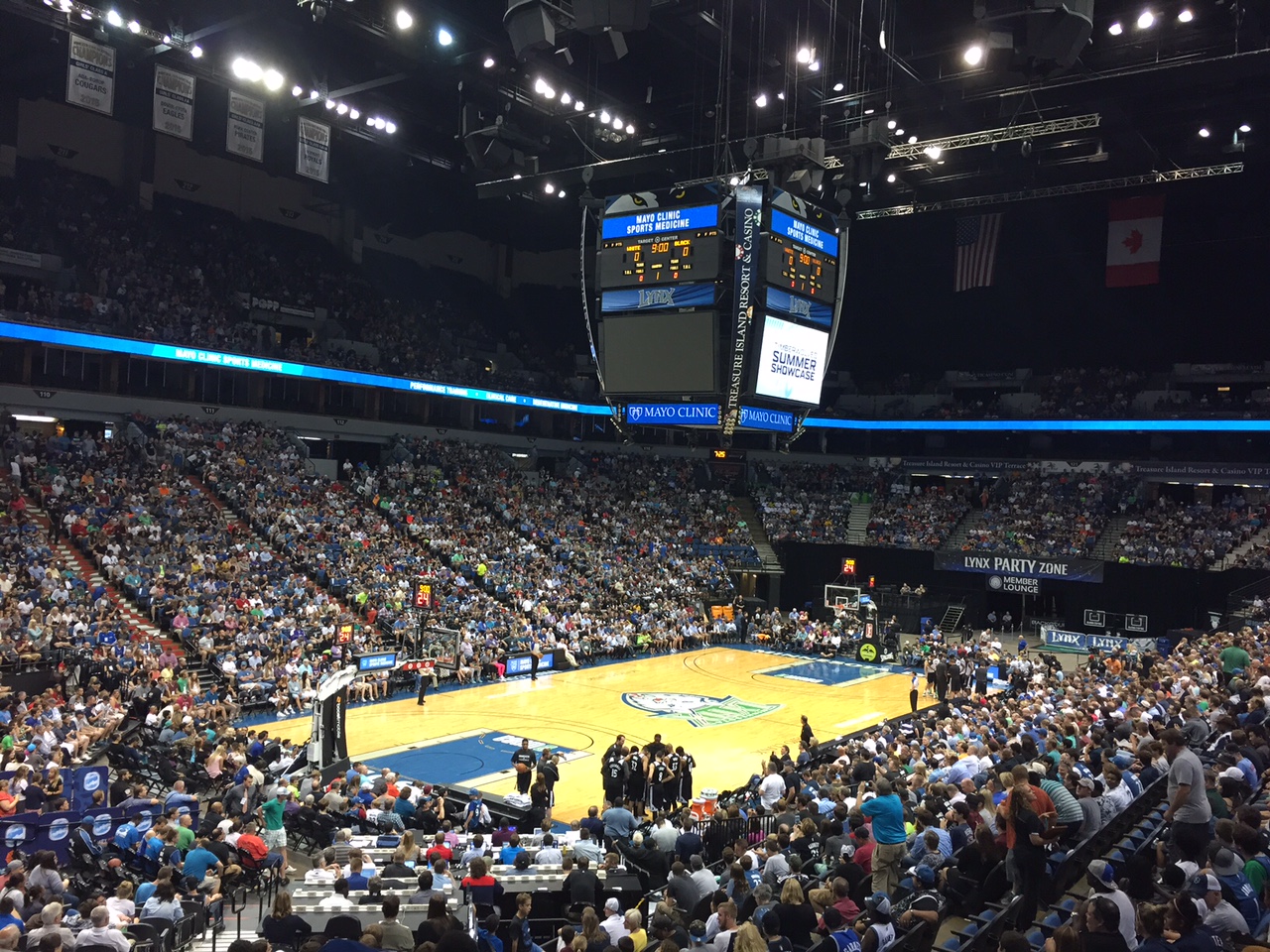Wolves fans got to the team warm up while doing stretches and a poor attempt at the three-man weave which turned into a dunk contest. As expected we saw LaVine make dunks look effortless and Wiggins do his Rookie Game 360 dunk. What was surprising was seeing Towns do two different variations of the between-the-legs slam. The crowd was also pleased to see Brady Heslip slam.